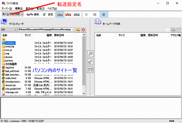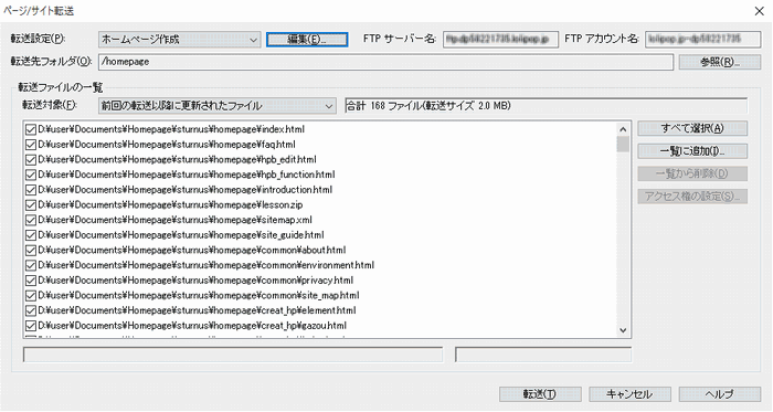転送対象・・・「前回の転送以降に更新されたファイル」を選び、[転送]