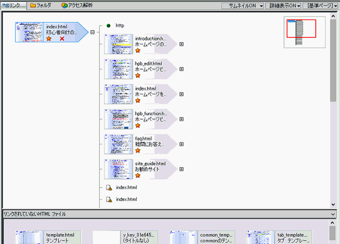 - トップページからリンクされたHTMLファイルが階層構造で、リンクエラーがあるファイルや、リンクされていないファイルが表示されます。