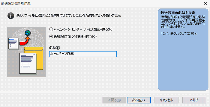 「その他プロバイダを使用する」をon、わかりやすい名前(転送設定名)を付けて[次へ]