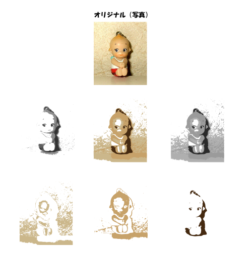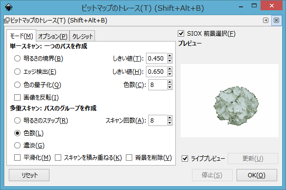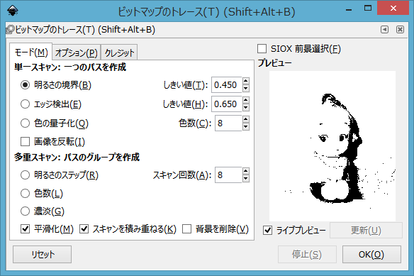 明るさのしきい値を0.2~0.9まで変化してスキャンします。スキャンの結果得られるパスは、指定より1つ多くなります。「背景を削除」にチェックがあると、0.9のスキャン結果は表示されません。