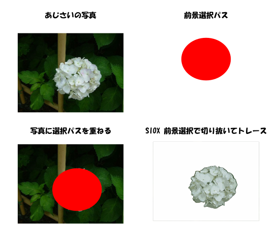 ここにあじさいの写真があります。花びら中心にトレースしたいと思いますが、このままトレースすると、花びら以外もパスになります。