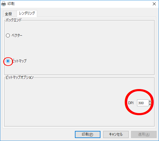 印刷ダイアログ 「レンダリング」タブで、ビットマップ、オプション300dpiを指定してください。