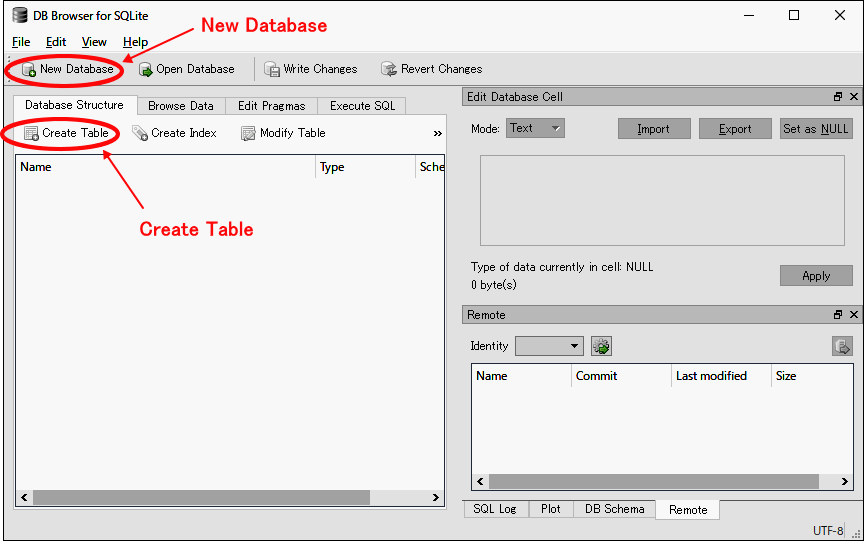 DB Browser for SQLiteを実行します。(日本語化されていませんが、わかりやすい英語です。)