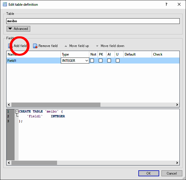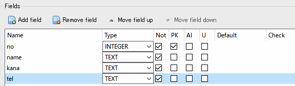 - Type・・・フィールドのデータ型を指定します。no(名簿番号)は、データベースのプライマリキーです。プライマリキーは、integer(整数)で指定します。その他のカラムはtextr(文字列)に指定します。