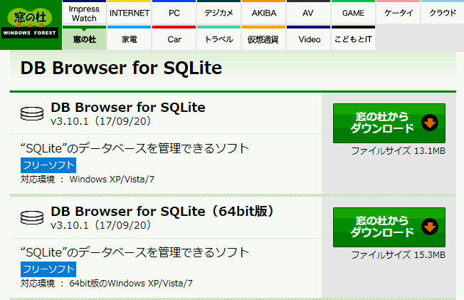 窓の杜 のサイトを開く DB Browser for SQLiteQLite