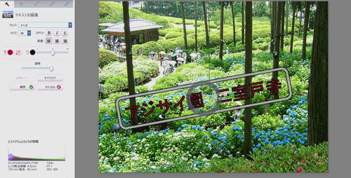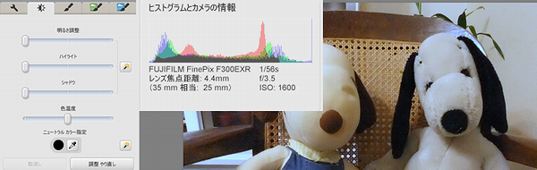 編集コントロールの下にヒストグラムが表示されています。編集すると、そのヒストグラムが変わります。変わり方を確認してください。
