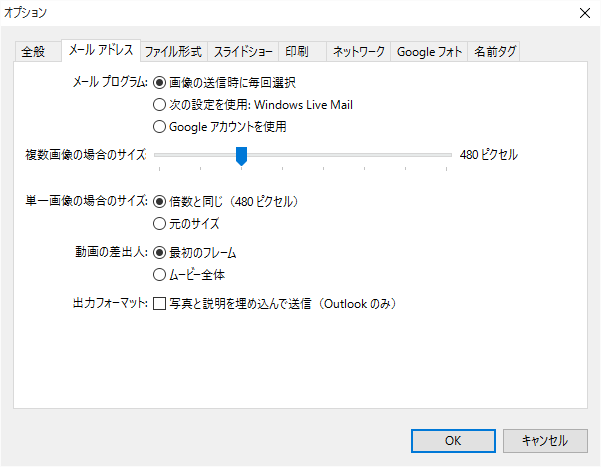 メールに添付する写真のサイズを指定します。メールで大きな写真(サイズの大きい)を送ろうとすると、エラーになる場合がありますし、送信時間がかかりますので、通常480ピクセル程度で送ります。